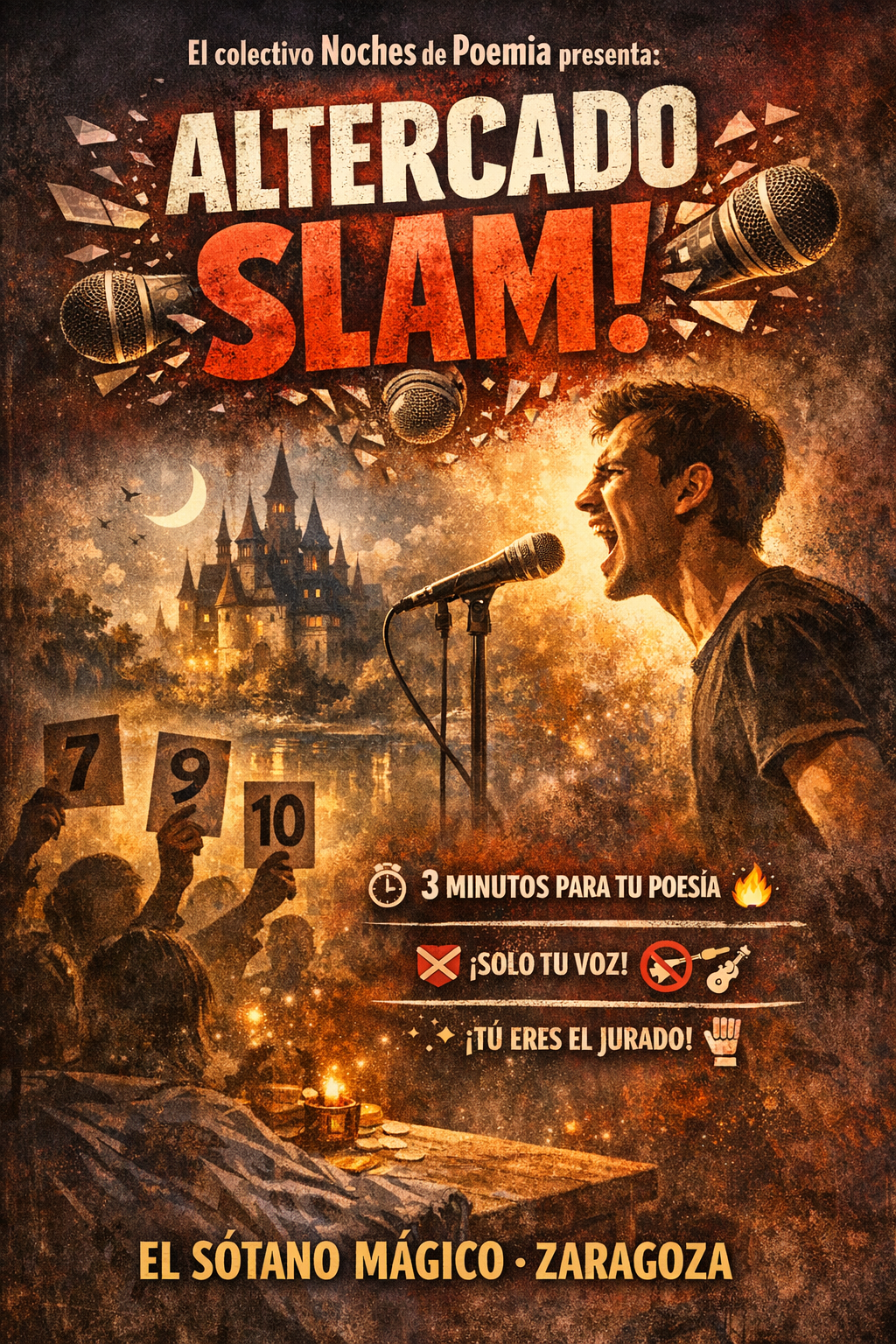 Zaragoza vuelve a la competición poética del «Altercado Slam!» que organiza el colectivo Noches de Poemia. En el altercado los poetas cuentan con un máximo de 3 minutos para recitar un texto propio sin el uso de música ni disfraces y el público será el encargado de puntuar a los participantes.